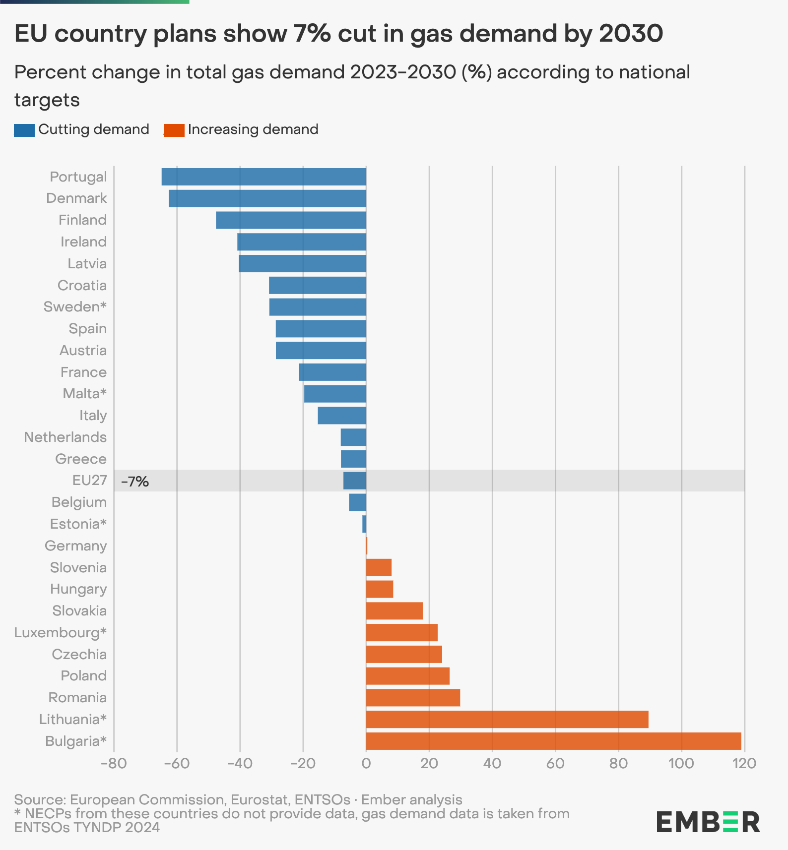 L’analisi di Ember sui piani energetici nazionali degli Stati membri UE mostra che la domanda di gas nell’Unione passerà da 326 miliardi di metri cubi nel 2023 a 302 miliardi di metri cubi nel 2030, una diminuzione del 7%.