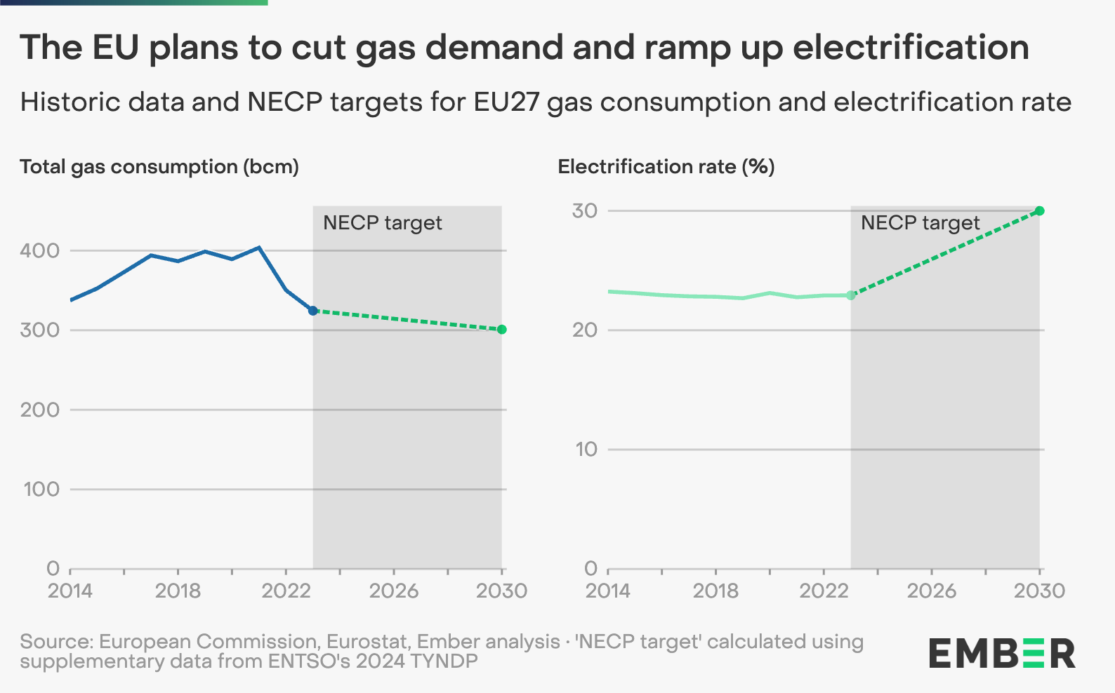 L’analisi di Ember sugli obiettivi energetici nazionali mostra che l’uso del gas nell’UE è destinato a diminuire, mentre aumentano elettrificazione e rinnovabili