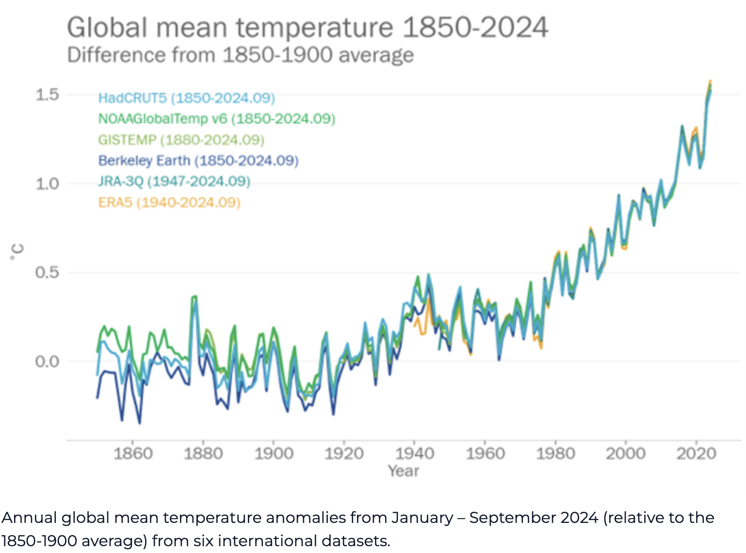 La temperatura media globale dell’aria superficiale da gennaio a settembre 2024 è stata di 1,54 °C (con un margine di incertezza di ±0,13 °C) al di sopra della media preindustriale, aumentata da un evento di riscaldamento El Niño.
