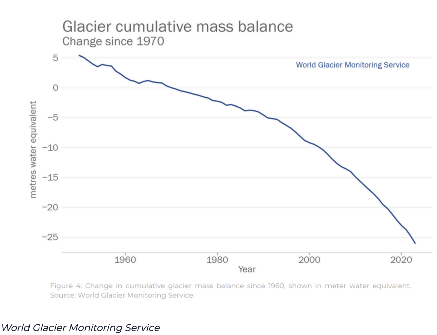 Nel 2023, i ghiacciai hanno perso un record di 1,2 metri di acqua equivalente di ghiaccio, circa cinque volte la quantità di acqua nel Mar Morto.