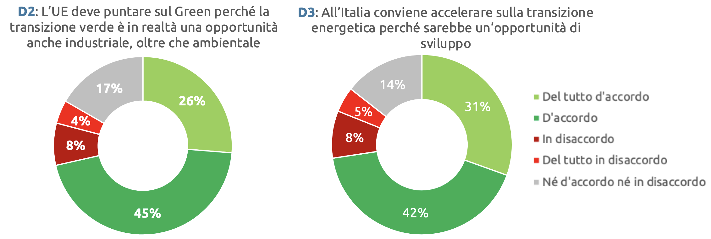 A livello geografico, il sud mostra una maggiore fiducia nel Green Deal, nelle fonti rinnovabili, nella transizione energetica e nel ruolo attivo degli imprenditori. Mentre il campione del nord Italia si mostra leggermente più scettico sugli stessi temi rispetto a centro e sud.