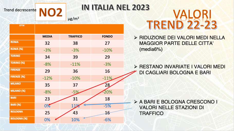 Come riportato in Tabella 1 del Rapporto “MobilitAria 2024” la maggior parte di esse hanno registrato, seppur di pochi punti percentuali, una riduzione delle concentrazioni medie che varia dal 3% al 12% mentre restano invariate quelle di Cagliari, Bologna e Bari.