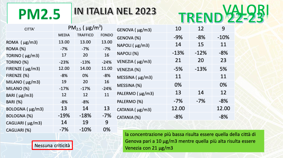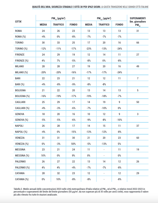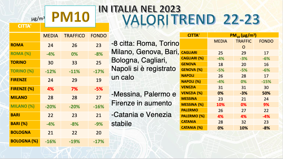 Come riportato in Tabella 2 del Rapporto, per le città di Roma, Torino, Milano, Genova, Bari, Bologna, Cagliari, Napoli si è registrato un decremento delle concentrazioni del PM10, mentre per Messina, Palermo e Firenze il 2023 è stato un anno in modesta risalita, permangono stabili Venezia e Catania.