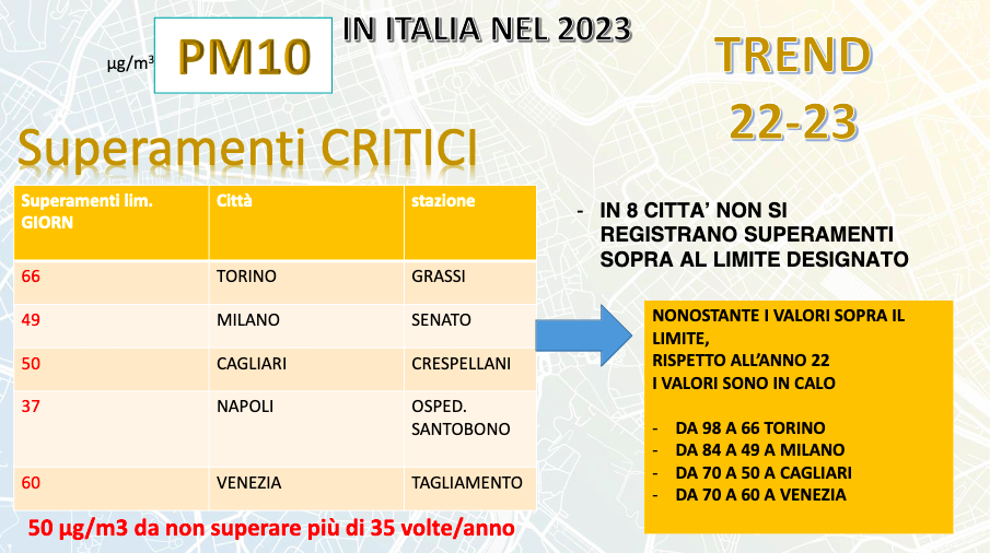 Nonostante la generale tendenza in discesa delle concentrazioni, per Torino, Milano, Cagliari, Napoli e Venezia si rilevano diversi episodi di superamento del limite annuale (50 μg/m3 da non superare più di 35 volte/anno). Per Milano, Torino, Cagliari, e Venezia, rispetto al 2022, i superamenti hanno subito una riduzione importante, fino ai 35 superamenti in meno a Milano e 32 a Torino, 20 a Cagliari, 10 a Venezia.