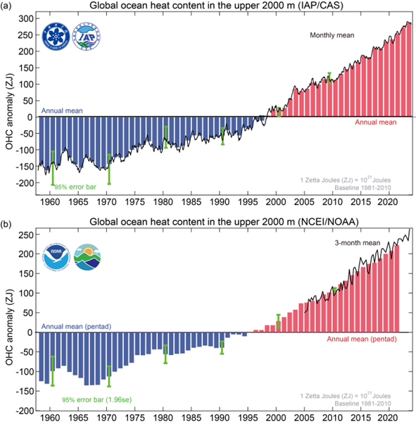 Figura 1: Contenuto termico progressivo dell’oceano dalla fine degli anni ’50, in base ai due set di dati utilizzati nello studio. La linea di riferimento corrisponde alla temperatura media dell’oceano calcolata nel periodo 1981-2010 e viene mostrata la differenza rispetto a questo valore. Le barre blu indicano acque più fredde rispetto alla media del periodo 1981-2010, mentre le barre in rosso rappresentano acque più calde. Il grafico superiore mostra i risultati di IAP, quello inferiore di NOAA.