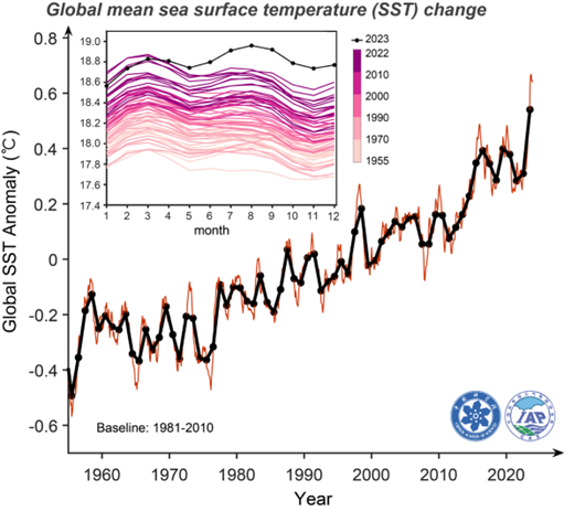 Figura 2: Variazione totale della temperatura marina superficiale (Sea Surface Temperature – SST) dal 1955 al 2023 ottenuta dall’analisi dei dati (1 m) del primo livello della griglia IAP/CAS. La linea nera rappresenta il valore annuale e quella rossa il valore mensile. Le anomalie sono sempre relative al periodo di riferimento 1981-2010. La variazione annuale di SST è mostrata nel riquadro interno, con i valori del 2023 mostrati in nero.