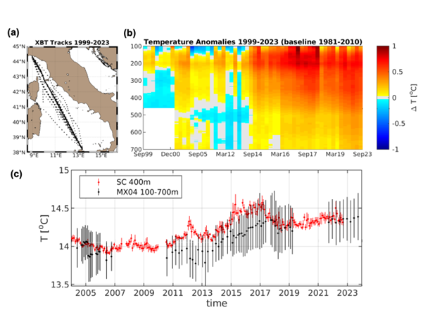 Figura 3: Temperatura lungo il transetto MX04 Genova–Palermo (Mediterraneo occidentale) registrata con sonde XBT lanciate da navi d’opportunità e valori medi mensili della temperatura a 400 m dalla boa del Canale di Sicilia. (a) Tracce XBT nel Mar Tirreno e nel Mar Ligure. (b) Grafico Hovmöller delle anomalie medie della temperatura MX04 nel periodo 1999-2023 calcolato sottraendo la linea di base 1981-2010 dei dati IAP/CAS. (c) Valori di temperatura media MX04 calcolati negli strati di 100–700 m, e valori di temperatura media mensile a 400 m dalla boa del Canale di Sicilia, tra il 2004 e il 2023, con le barre di errore che rappresentano le relative deviazioni standard.