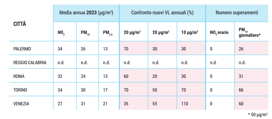 Nella tabella seguente sono evidenziate le città metropolitane che, nel 2023, non rispettavano i nuovi valori limite e per cui, quindi, sarebbe necessario iniziare quanto prima la predisposizione di una road map.